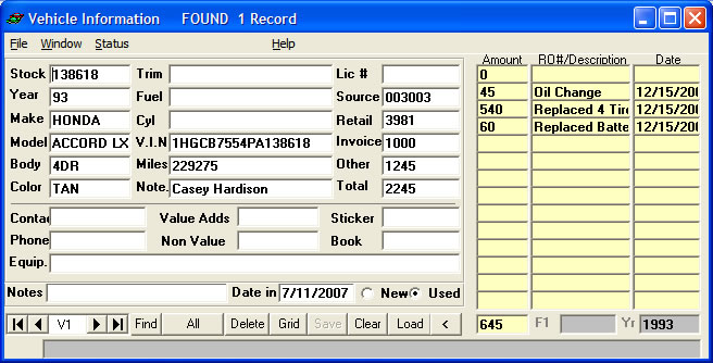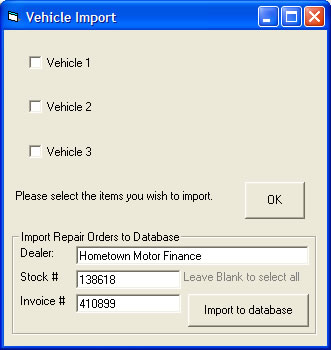 This module has three choices to import into one of the 3 databases. Make sure your Company name matches the one used in Quickbooks, this information is loaded from your Defaults module. Enter the stock number of the vehicle you wish to update, and the Quickbooks invoice, or internal number, and select the Import to database button. |