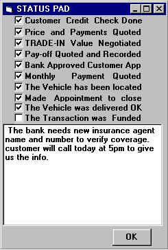 The Status Pad is a note keeper attached to each transaction quote. You can use it to log your progress in the closing of the deal and to make notes that may aid in remembering your client and log any promises or comments made Information Request...