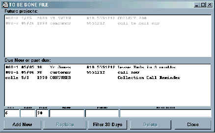 To enter the TODO file you may choose TODO from the tools menu or click the "You have 1 item TODO today" message when displayed. |