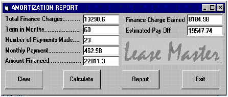 The unique feature of this Month To Date Report System is that there is no Database to maintain or update when a customer moves or a change is needed. The Lease Master stores all your sold transactions in a separate Directory in your computer (:\LEASE\LESD.WRK) The Month To Date File only contains a list with the last name, stock number, and date of the transaction. When you request a report, the program checks the list and recalls each transaction to retrieve the information needed. So if your customer moves you only need to update the transaction in the sold files and your reports will be correct.