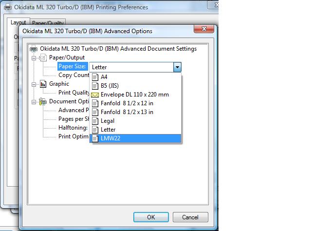 Some printer manufacturers have issued new drivers that have less flexibility for paper size, for example the Driver for the Epson LQ 570+ will work for both the Epson LQ570+ and the Epson LQ 570e and the Epson LQ1070+ works better than the 2080 for the wide carriage printer. Okidata ML320 TURBO is also used a lot.