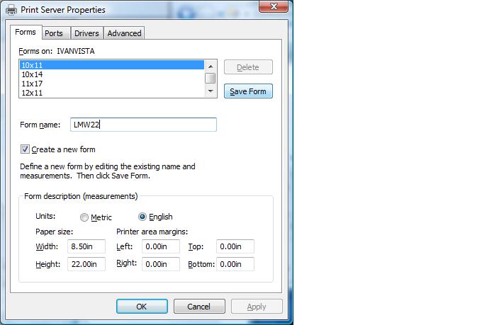 If your form is longer than 22 inches, you can install the printer driver of a IBM Proprinter III, (make sure the printer is in the IBM ppr emulation mode), Make the width 8.0 in and the length as long as your longest form.